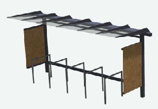 Fahrradstaender mit Holzwaenden, die Außenseiten sind für "Werbezwecke" als Tauschtextur ausgefuehrt.