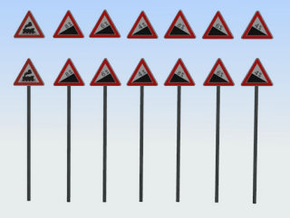 Schilder für Steigung / Gefälle in verschiedenen Prozenten sowie eine alte Version des Bahnübergangsschildes
