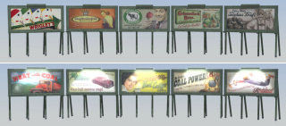 Diese großen Plakatwände nach amerikanischem Vorbild findet man häufig entlang der Bundesstraßen oder Highways. Gerne verstecken sich dahinter auch Polizeiwagen, um Geschwindigkeitskontrollen durchzuführen. Im Set sind weitere 6 Plakatwände mit verschiedenen Motiven enthalten. Die Modelle sind bei Dunkelheit dezent beleuchtet.