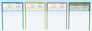 Schaukästen für Fahrpläne usw. in den Farben blau, gelb, grün und grau.
