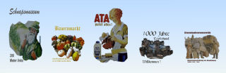 5 Wandbilder zum "aufkleben" an Giebel- oder Brandwände. 5 Themen: Schnapsmuseum, Töpferstadt, Bauernmarkt, Modellbahnausstellung und ATA-Werbung. Alle etwas angeknabbert, ausgeblichen und mit Farbschäden. Abgebildete Größe ist Originalgröße, sind aber gut skalierbar.