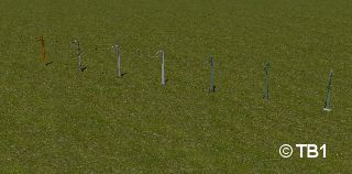 In diesem Modellset befinden sich 7 Endmasten 1-gleisig in den Ausführungen neu (DB, DR und Epoche 6), gealtert (DB und DR), alt (nur DR) und einem Sonderwunsch in der rot-orangenen Farbe Bleimennige (DR EndmastR 1gl_TB1).