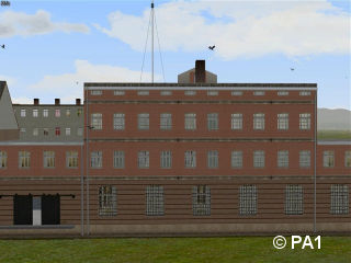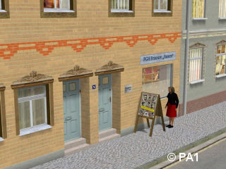 Dieses Wohnhaus ist ein Billigbau der Gründerzeit. Flachdach, keinerlei Stuck/ Putzelemente sondern als Zierde lediglich Ziegelformationen, ordnen diese Haus am hinteren Ende der Bahnhofstraße ein. Um das zu unterstreichen, liegt dem Modell eine Platte aus groben Kopfsteinpflaster (Katzenköppe) für die Hinterhofgestaltung bei.